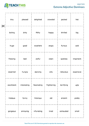 In this fun adjectives game, students play dominoes by matching adjectives with their stronger equivalents. This activity helps students learn to recognize adjectives that have a similar but stronger meaning, e.g. angry and furious, cold and freezing, etc. The first player puts down one of their dominoes on either side of the domino on the table, making sure that one of the adjectives on their domino matches with one of its stronger or weaker equivalents. The next player then puts down an adjective at either end of the domino chain and so on. The first player to get rid of all their dominoes wins the game.