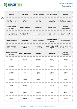 In this engaging adverbs of frequency game, students formulate How often do you...? questions and give answers with adverbs and expressions of frequency. The first student picks up a verb card and thinks of a How often do you...? question using the verb on the card. The student then asks the question to the second student. If the student formulates the question correctly, they keep the card. The second student picks up a frequency card and answers by making a sentence with the frequency adverb or expression on the card. If the student forms their answer correctly, they keep the card. The second student then picks up a verb card and asks a question to the third student and so on. If a student makes a grammar mistake or is unable to form a question or answer, another student can steal their card by correctly forming it for them. The student with the most cards at the end of the game wins.