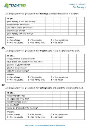 In this enjoyable adverbs of frequency speaking activity, students conduct a survey where they ask each other present simple yes/no questions with Do you...? and respond to questions with short answers and frequency adverbs. In groups, each student conducts a survey to find out about the topic on their form, e.g. holidays, eating habits, etc. Students ask each other the Do you...? questions on their form and respond to their classmates' questions with short answers and frequency adverbs, e.g. 'Yes, usually', 'No, hardly ever', etc. Students record these answers in a chart on their form. Afterwards, students write sentences based on the results of their survey using phrases from the board. When the students have finished, they report back to the class on their findings.