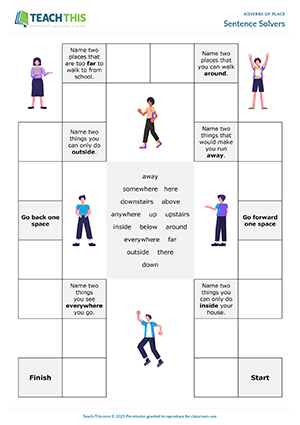 In this entertaining adverbs of place board game, students race to complete sentences with adverbs of place. In groups, students take turns picking up a card and reading the sentence to the other students using the word 'blank' for the adverb of place in brackets, e.g. 'I am very tired. I need to sit BLANK.' The other students listen to the sentence and race to choose an adverb of place from the game board and say it aloud to complete the sentence, e.g. down. The first student to say the correct adverb of place shown on the card rolls the dice and moves their counter along the board. If a student lands on a square beginning with 'Name two...', they name two things to match the description to remain on the square. If they are unsuccessful, they move back one space. The first student to reach the finish wins the game.