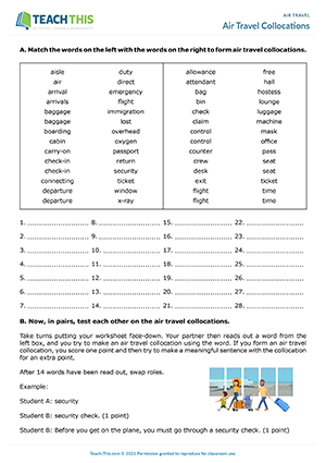 In this productive air travel activity, students form air travel collocations from a set of words and play a game to practice the collocations. First, students match words together to form 28 air travel collocations. Next, in pairs, one student puts their worksheet face-down, and their partner reads out a word from the box. The student then tries to make an air travel collocation using the word. If the student forms an air travel collocation, they score one point and then try to make a meaningful sentence with the collocation for an extra point. After 14 words have been read out, the students swap roles. The student with the most points at the end of the game wins.