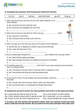In this rewarding clothes conversation questions activity, students complete and discuss multiple-choice questions based on clothes and shopping to learn about each other's attitudes towards clothing. To start, students complete multiple-choice questions about clothes and shopping with phrasal verbs from a box on the worksheet. Next, students choose the correct answer for each multiple-choice question and write it in the space provided. In pairs, students then ask and answer the questions from the worksheet with their partner to find out each other's attitudes towards clothes. Afterwards, there is a class feedback session to find out if the students have the same attitudes towards clothes or not.