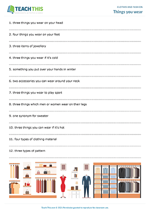 Here is a creative clothes and fashion quiz game to help students revise vocabulary related to clothing and fashion. Read the first clothes or fashion quiz question to the class. In teams, students discuss the answer to the question and then write it on the worksheet. Then, read out the next question and so on. When all the questions have been answered, the teams swap worksheets for marking. Teams score one point for each correct answer. The team with the most points at the end of the game wins.