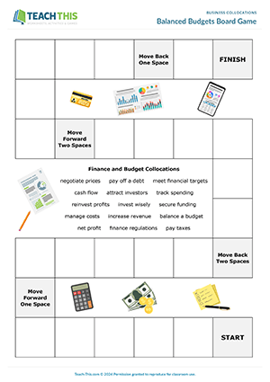 Here is a business collocations board game and worksheet to help students learn and practice collocations related to finance and budgets. To begin, students match finance and budget collocations with their definitions. Students then complete sentences by underlining the correct collocation. Next, in groups, students play a board game to practice the finance and budget collocations. Students take turns picking up a card and reading the sentence to the student on their right using the word 'blank' for the missing collocation, e.g. 'Businesses have to BLANK on their profits to the government.' The other student listens to the sentence, chooses a suitable collocation from the game board, and says it aloud in its correct form to complete the sentence, e.g. pay taxes. If the student says the correct collocation shown on the card, they roll the dice and move their counter along the board. If the student gives a wrong answer, they don't roll the dice. The first student to reach the finish wins the game.