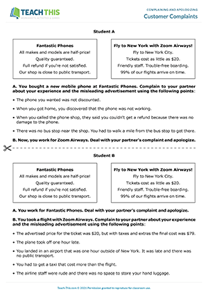 In this communicative complaining and apologizing role-play, students practice making and dealing with complaints about misleading advertisements. In pairs, students role-play the first complaint about buying a mobile phone with one student complaining and the other dealing with the complaint and apologizing. After that, students swap roles and role-play a second misleading ad complaint based on a flight. Afterwards, pairs present their role-plays to the class.