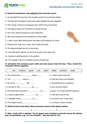 In this free concrete nouns activity, students practice identifying concrete nouns with a partner. First, students read out sets of nouns to their partner who guesses which noun is not concrete and then gives two more concrete nouns on the topic for them to write down. Next, students take it in turns to read out each sentence using the word 'blank' for the missing noun. Their partner listens and finds a pair of nouns shown in the box on their worksheet that matches the sentence and reads them out. When the student hears a pair of nouns that match, they choose which noun is the concrete noun and write it in the sentence. This continues until both students have completed all their sentences. When the students have finished, check the correct answers with the class.