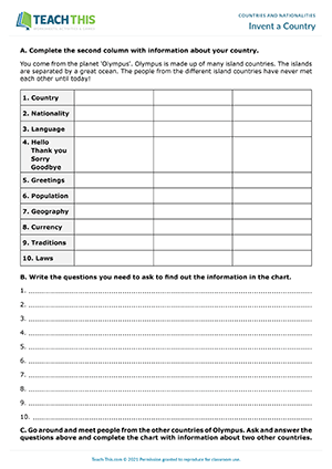 In this imaginative country information activity, students create a new country made up of the best qualities and features from other countries. In pairs, students begin by deciding on a name for their country. Students then complete their country's information, such as the climate, food, culture, people, environment, etc. Afterwards, pairs take it in turns to present their country to the class. Lastly, the class decides on which countries they liked the most and why.