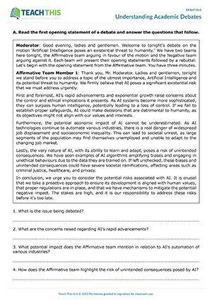 Here is a useful academic debates worksheet that introduces students to the way academic debates are conducted. First, students read the Affirmative team's opening statement addressing the motion, 'Artificial Intelligence poses an existential threat to humanity' and answer questions about it. Next, students read the Negative team's opening statement and answer three multiple-choice questions. Students then read the Affirmative team's rebuttal to the Negative team's opening statement and answer questions with either true, false or not given. Finally, students read the Negative team's rebuttal and decide which of three summaries provided is the best.