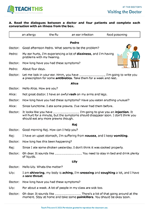 This comprehensive At the Doctor's worksheet helps students practice vocabulary and language for describing symptoms and giving medical advice. First, students complete conversations between doctors and patients with words from a box. Next, students categorise the words in bold from the conversations into body parts and symptoms. Students then match medical advice to the people in the conversations. After that, students unscramble sentences and place them in a doctor-patient conversation. Lastly, students practice their own doctor-patient conversations, choosing different symptoms, and taking turns to be the patient and the doctor each time.