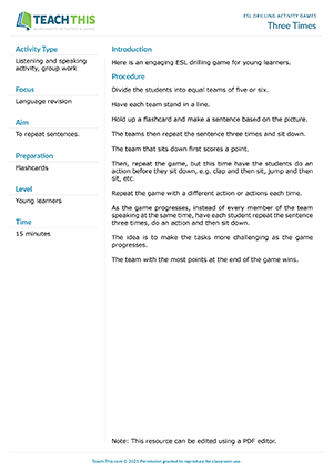 Here is an engaging ESL drilling game for young learners. Each team stands in a line. Hold up a flashcard and make a sentence based on the picture. The teams then repeat the sentence three times and sit down. The team that sits down first scores a point. Then, repeat the game, but this time have the students do an action before they sit down, e.g. clap and then sit, jump and then sit, etc. Repeat the game with a different action or actions each time. As the game progresses, instead of every member of the team speaking at the same time, each student repeats the sentence three times, do an action and then sit down. The idea is to make the tasks more challenging as the game progresses. The team with the most points at the end of the game wins.