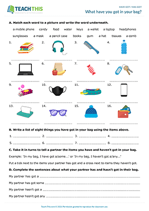 In this useful have got and has got activity, students learn vocabulary for basic everyday items and practice talking about what they and a partner have and haven't got. First, students match words to pictures of items commonly found in a bag and write the words underneath the pictures. Students then write a list of eight things they have got in their bag using the items from the worksheet. Next, students take turns telling a partner the items they have and haven't got in their bag. The other student puts a tick on their worksheet next to the items their partner has got and a cross next to the items they haven't got. Lastly, students complete sentences about what their partner has and hasn't got in their bag.