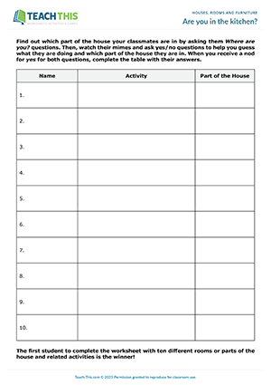 This engaging houses and rooms vocabulary game helps students practice making associations between particular activities and different rooms or parts of a house. First, students complete a sentence on a card with an activity that is associated with the room or part of the house shown, e.g. 'I'm making dinner in the kitchen.' Students then play a game where they mime and guess the sentences to find out which room or part of the house the other students are in, and what they are doing there. Students go around asking a classmate a 'Where are you?' question. Their classmate then mimes the sentence on their card. The first student then asks yes/no questions to help them guess the activity and part of the house, e.g. 'Are you eating breakfast?' 'Are you in the dining room?' When the student receives a nod for yes to both questions, they write their partner's name, what they are doing, and where they are in the relevant columns on their worksheet. The first student to complete their worksheet with ten different rooms or parts of the house and related activities is the winner.