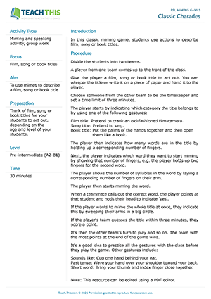 In this classic miming game, students use actions to describe film, song or book titles. A player from one team comes up to the front of the class. Give the player a film, song or book title to act out. The player then has three minutes to mime the title to their team. The player starts by gesturing whether it's a film, song or book title. The player then indicates how many words are in the title by holding up a corresponding number of fingers. Next, the player indicates which word they want to start miming by showing that number of fingers and the number of syllables in the word by laying a corresponding number of fingers on their arm. The player then starts miming the word. When a teammate calls out the correct word, the player points at that student and nods their head to indicate 'yes'. If the player wants to mime the whole title at once, they indicate this by sweeping their arms in a big circle. If the player's team guesses the title within three minutes, they score a point. It's then the other team's turn to play and so on. The team with the most points at the end of the game wins.