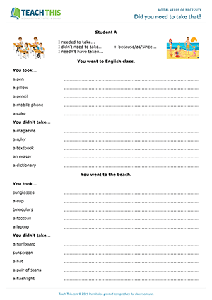 In this engaging needed to and didn't need to speaking activity, students practice expressing past necessity by talking about the need for certain items in different situations. In two groups, students imagine that they went to each place mentioned on the worksheet. Next, students look at the items they took and didn't take to each place and think about whether they needed to take each item with them or not. Students then write a sentence for each item using I needed to take..., I didn't need to take..., or I needn't have taken... Finally, in their groups, students discuss whether they needed to take the items or not.
