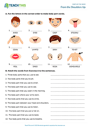 This comprehensive parts of the body worksheet helps students learn and practice vocabulary for body parts above the shoulders. Students begin by unscrambling body part words that correspond to pictures. Students then match the body parts to sentences. Next, students categorise the body part words according to the adjectives that can be used to describe them. After that, students choose the correct body parts to complete facts about the body. Finally, students match sentence halves to make parts of the body-related questions and then ask and answer the questions with a partner.