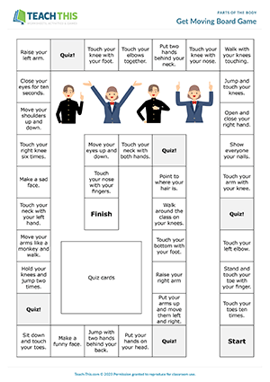In this lively parts of the body board game, students practice parts of the body vocabulary by acting out simple instructions and answering quiz questions. In groups, players take turns to roll the dice and move their counter along the board. When a player lands on a square, they act out the command written on the square, e.g. 'Touch your elbows together.' If the player acts out the instruction correctly, they stay on the square. If not, they move back two squares. When a player lands on a quiz square, another student picks up a quiz card and asks the question on the card to the player, e.g. 'Which part of your body can hear?' If the player answers correctly, they stay on the square. If not, they move back. The first player to reach the finish wins the game.