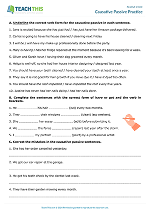 Here is a detailed causative passive worksheet to help students practice combining causative verbs with the passive voice. First, students underline the correct verb form for the causative passive in each sentence. Students then complete sentences with the correct form of have or get and the verb in brackets. Next, students identify and correct errors in causative passive sentences. After that, students rewrite sentences, changing them from the active voice to the causative passive following the structure to have + something + participle. Next, students use prompts to write affirmative or negative sentences that are true for them using the causative passive. Finally, in small groups, students discuss questions using the causative passive in their responses.