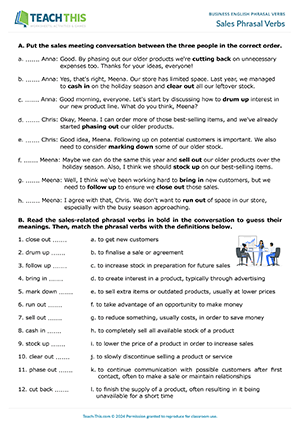 In this free sales-related phrasal verbs worksheet, students learn and practice 12 phrasal verbs commonly used in sales. Students start by putting a sales meeting conversation in the correct order. Students then read sales-related phrasal verbs in bold from the conversation to guess their meanings and then match each one with a definition. Next, students complete sentences with the sales phrasal verbs, changing the tense as needed. Lastly, in pairs, students ask and answer questions that contain the sales-related phrasal verbs.