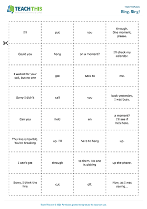 In this free telephone language game, students race to match common telephone phrases with appropriate responses. The aim of the game is to race to find the students who have matching replies to common telephone phrases. One student begins the game by reading a card to one of the other students, e.g. 'Who's calling, please?' That student then looks for a matching reply on their cards. If the student has a matching response, they read it aloud to the group, e.g. 'My name is Elliot Lewis.' If everyone agrees the cards go together, the group member gives the card to the student who wins the matching pair. If the student doesn't have a matching response, the first student waits until their next turn before saying the telephone phrase to another student. The second student then reads a card to one of the other students, and so on. The first student to get four matching pairs of cards wins the game.
