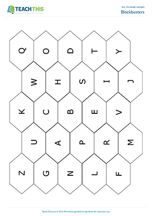 This ESL vocabulary game comes from an English TV game show. The game can be used as a general knowledge quiz or to revise vocabulary. Draw a five-by-five hexagon on the board. Write a different letter of the alphabet in each hexagon. The two teams then decide which direction they want to play - top to bottom or left to right. The aim of the game is to connect the hexagons from one side of the grid to the other. Tell the students that this is a fairly strategic game, and they need to choose their moves carefully in order to win the game, blocking the other team when necessary. Start with the center hexagon. Give a clue for the letter in the hexagon, e.g. if the letter was B, the clue might be: A person who bakes bread. The two teams then race to answer, e.g. baker. The first team to answer correctly wins the hexagon and it is coloured accordingly. The winning team then chooses the next hexagon. Give a clue for the letter in that hexagon, and both teams race to answer as before. The first team to connect their hexagons from top to bottom or left to right wins the game.