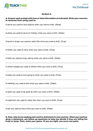 In this amusing used to game, students give true and false information about their childhood. First, in two groups, students answer each prompt with true or false information as indicated, writing their answers in sentence form with used to. Next, students pair up with someone from the other group and take turns reading each used to statement to their partner, e.g. 'I used to love playing chess when I was a child.' Their partner then asks follow-up questions to help them decide whether the answer is true or false. Their partner then guesses if the student is lying or telling the truth and the correct answer is revealed. If their partner guesses correctly, they score a point. The student with the most points at the end of the game wins.