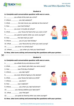 In this interesting was and were speaking activity, students practice completing, asking and answering was and were conversation questions. First, in two groups, students complete each conversation question with was or were. Next, students pair up with someone from the other group and take turns asking and answering the conversation questions with their partner. Afterwards, students share what they found out about their partner with the class.
